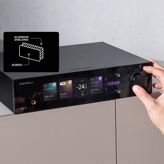 The EverSolo DAC-Z10 is crafted from aviation-grade aluminum, combining rigidity with refined elegance. Its robust chassis acts as both a visual centerpiece and a shield against electromagnetic interference. The front panel features an 8.8-inch IPS touchscreen, providing intuitive control