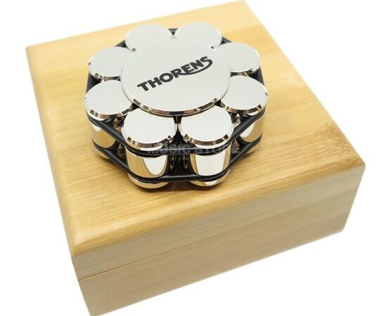 Το Thorens Stabilizer έχει σχεδιαστεί για να κάθεται πάνω από τον άξονα για να διατηρεί τα βινύλια επίπεδα κατά την αναπαραγωγή, βελτιώνοντας τη σταθερότητα και την παρακολούθηση.