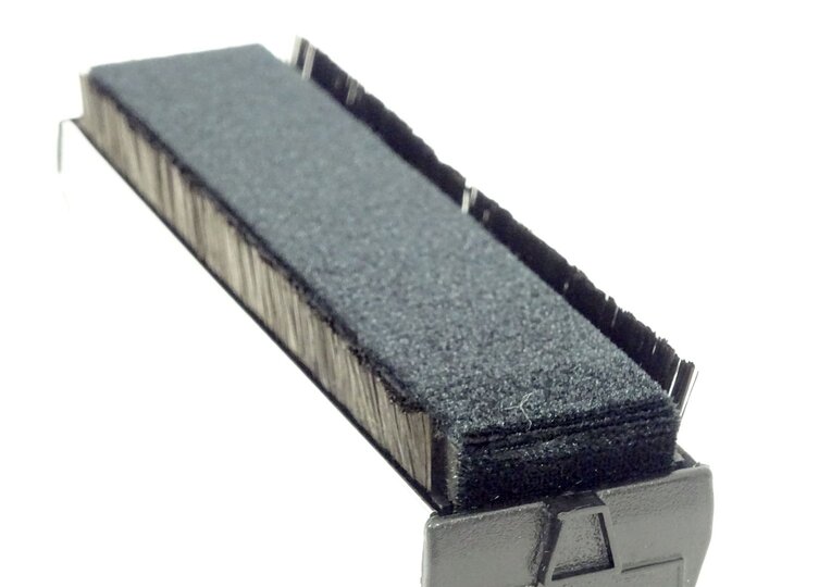 This velvet is flanked on both sides by a thick layer of very fine carbon fibers. The carbon fibers remove the static from the record so the dust lays loose and can be easily picked up by the velvet in the middle of